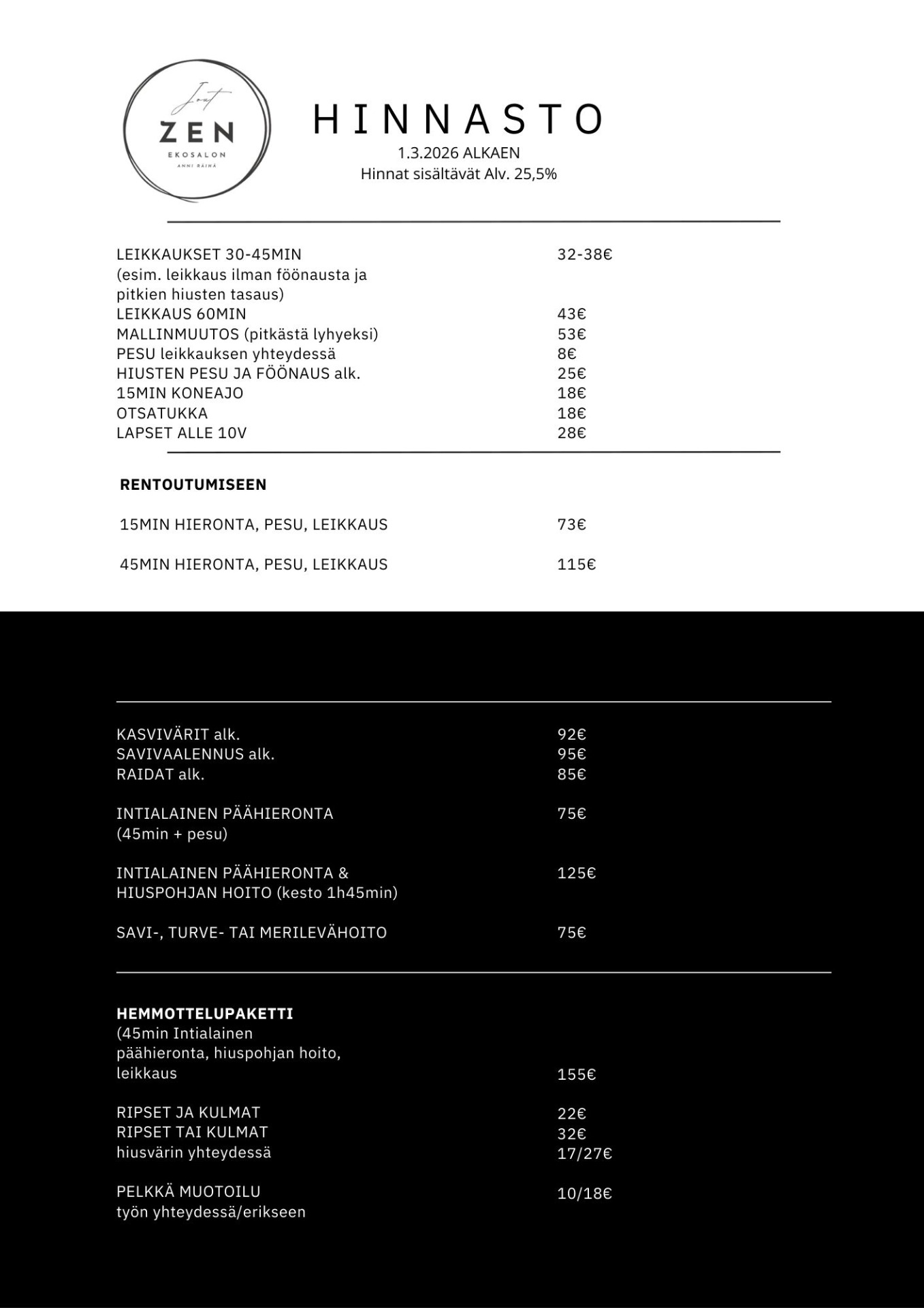 Uusi hinnasto voimassa 1.3.2026 alkaen. Hinnat sisältävät Alv 25,5%